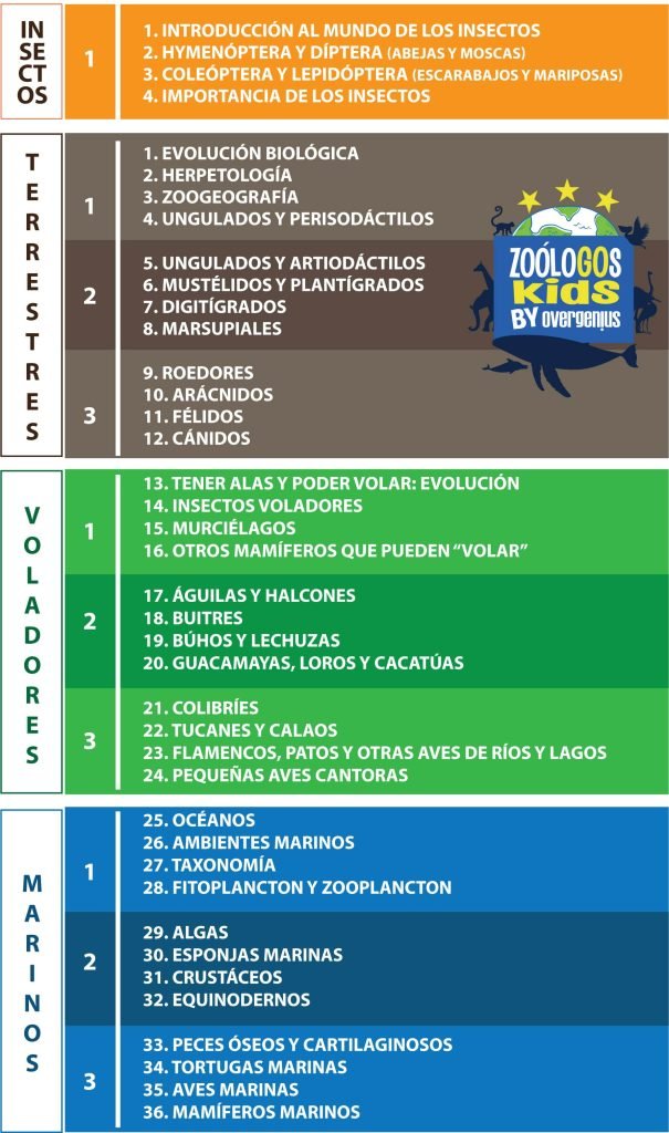 El programa de ZOOLOGÍA consta de un total de 36 sesiones para abarcar animales Marinos, Voladores, Terrestres e Insectos.